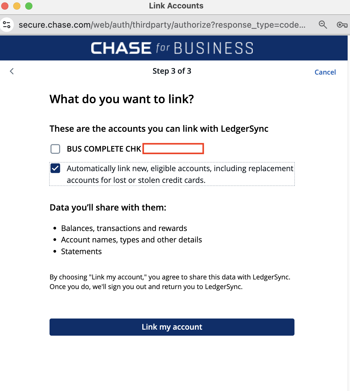 If a user has both personal and business accounts under one login, and only authorizes business accounts during setup, the bank will not permit changes later. To include additional accounts, the connection must be deleted and re-authorized so the user can explicitly approve the full set of accounts again.
