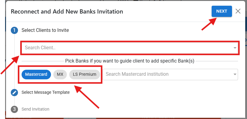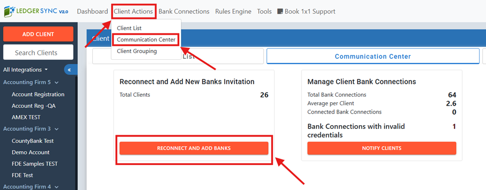 Client Actions → Communication Center → Reconnect and Add Banks.
