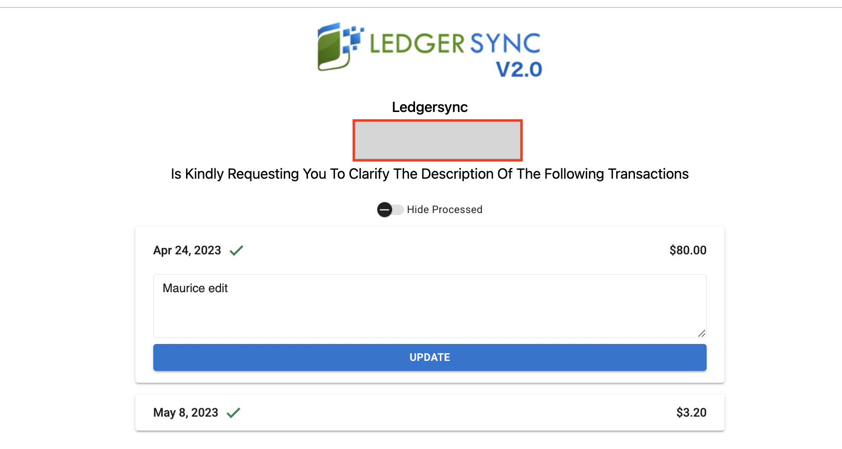 Once updated, the transaction details appear on the Transactions page.